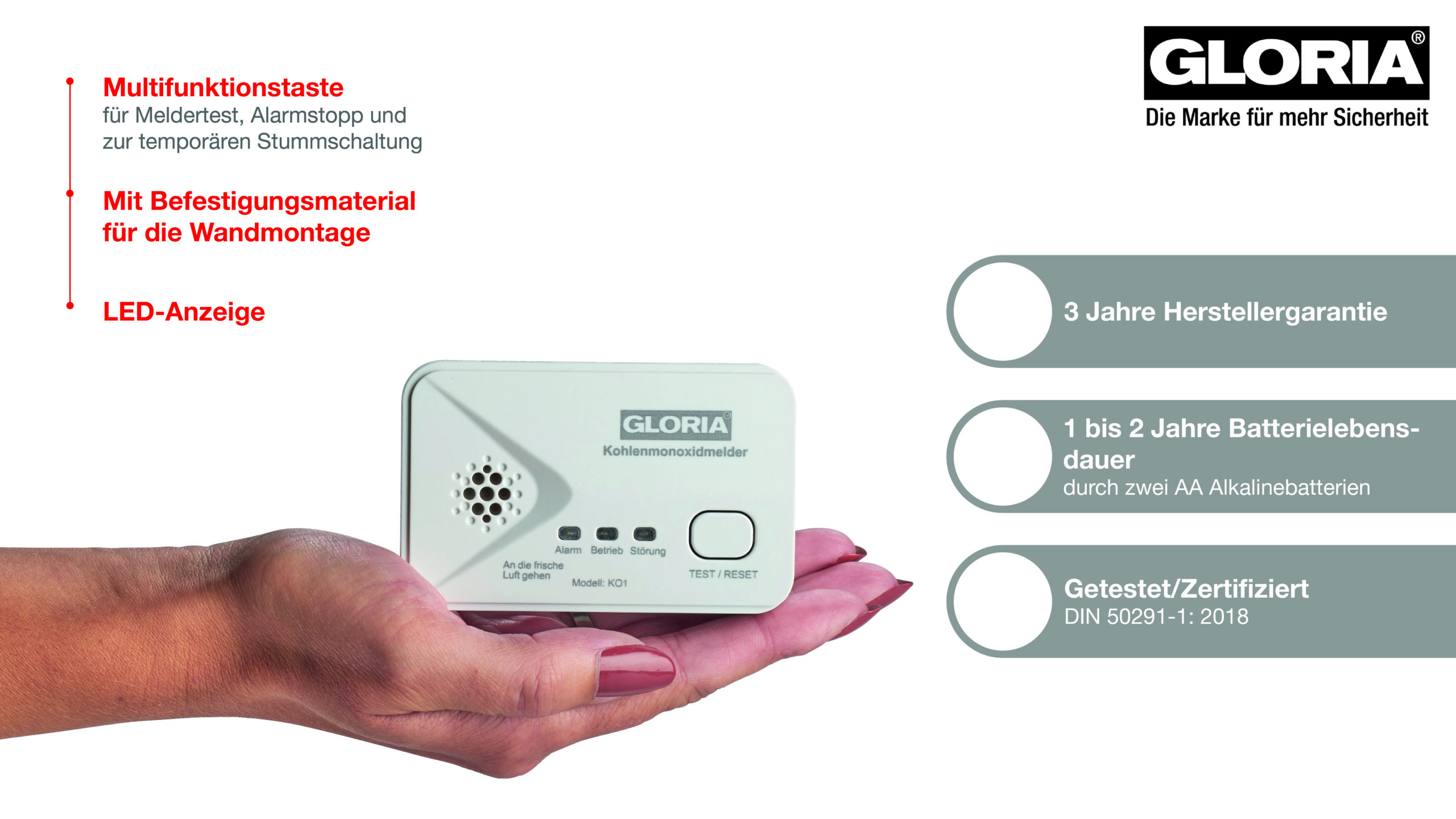 Preiseinstiegs CO-Melder mit Test Funktion, End of Life Anzeige und auswechselbaren AA Batterien. Nach neuester Norm getestet