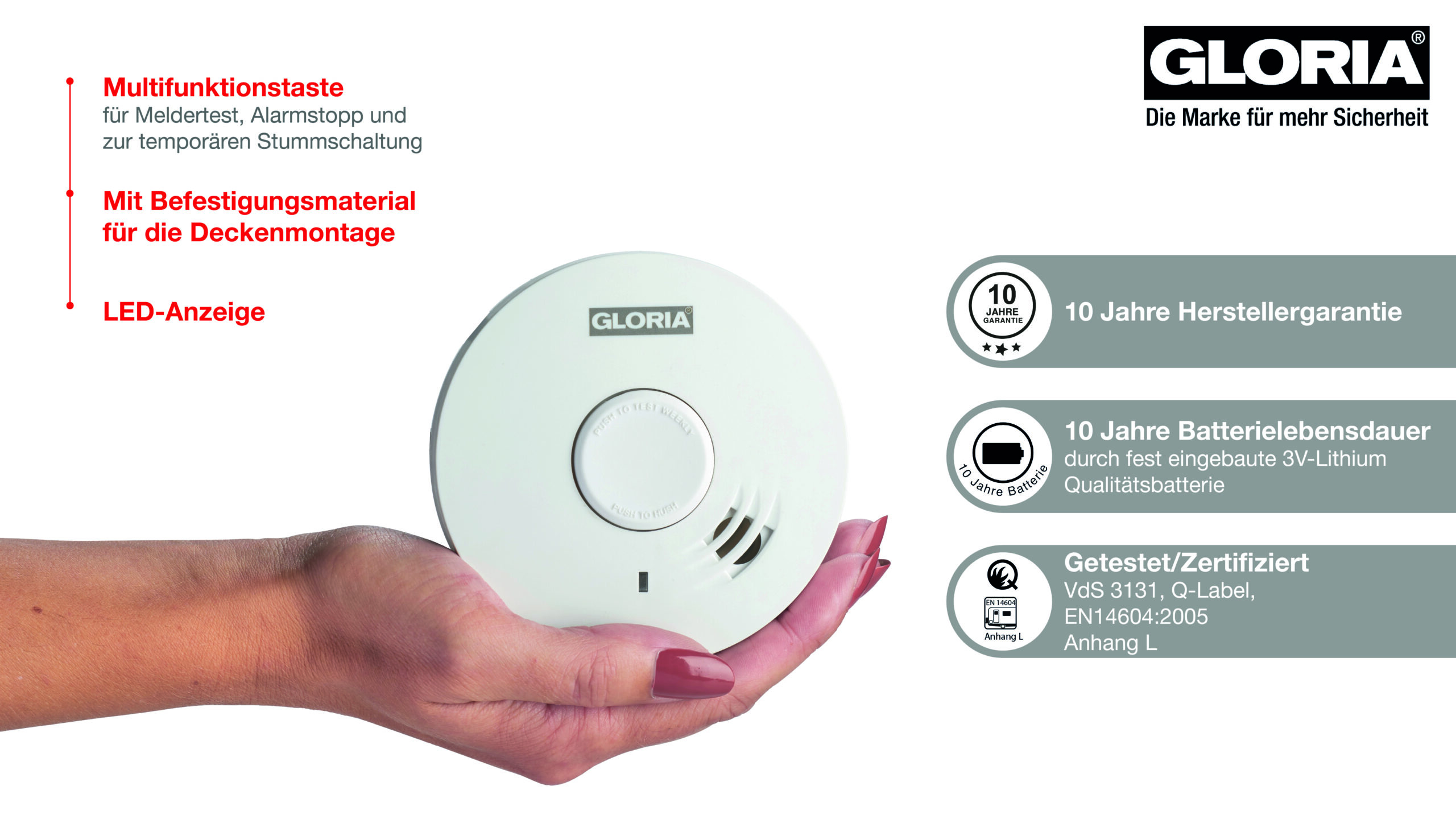 | Normen/Zertifizierung | EN 14604:2005+AC : 2008, Anhang L, VdS 3131, Q-Label, vfdb 14/01 |