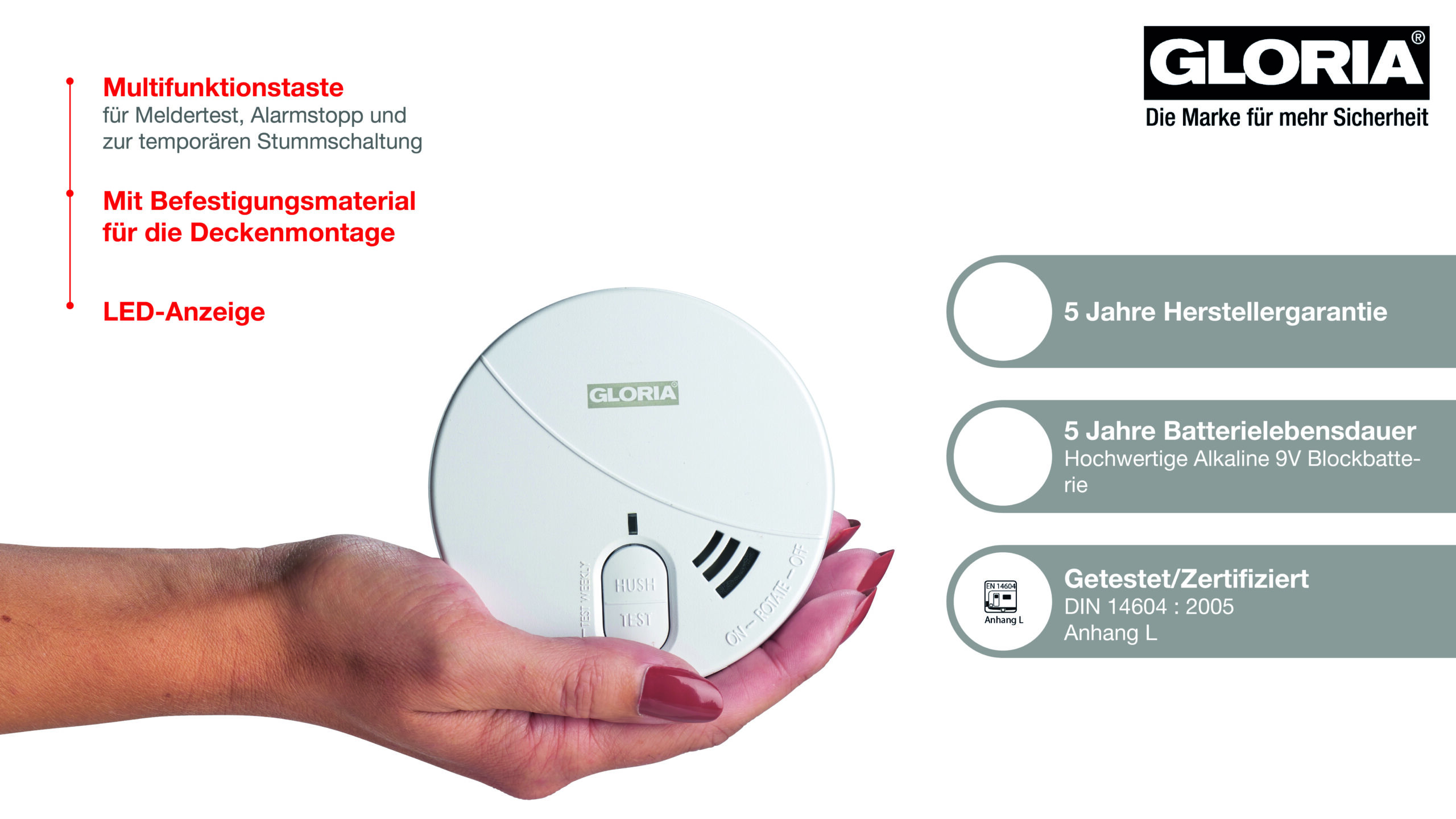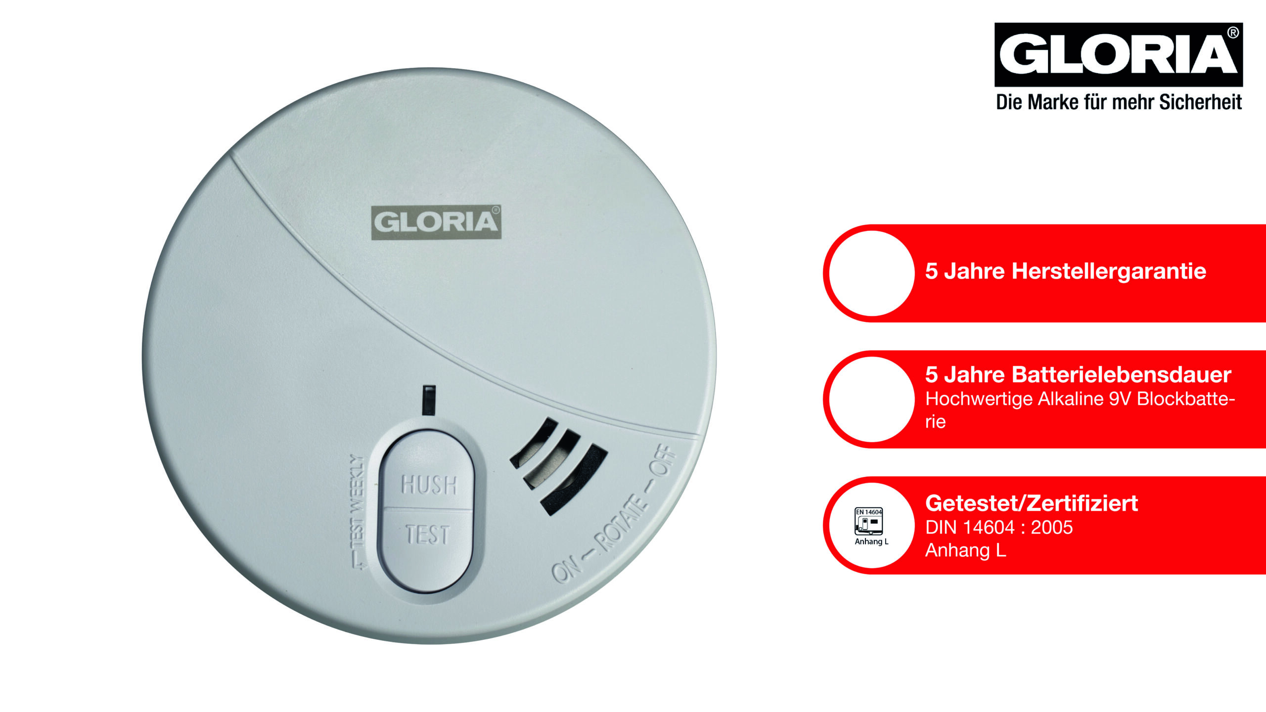 | Normen/Zertifizierung | EN 14604:2005+AC : 2008, Anhang L |